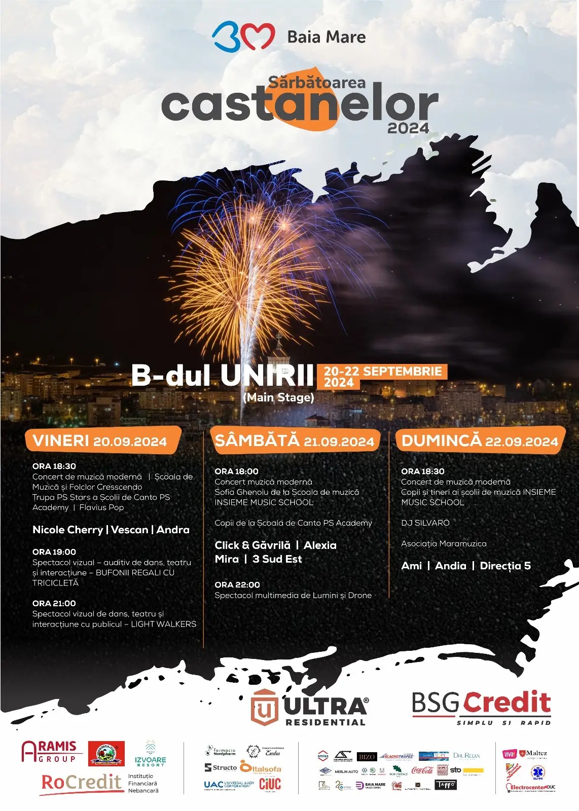 Cea de-a XXIX-a ediție a Sărbătorii Castanelor va avea loc între 20 și 22 septembrie. Organizatorii au pregătit următorul program artistic pentru scena din Piața Libertății: Vineri, 20 septembrie 2024 14:30 – Spectacol muzical-coregrafic: 16:00 – Spectacol vizual și auditiv de dans, teatru și interacțiune: 18:00 – Concert de blues și rock: 19:40 – Spectacol […]